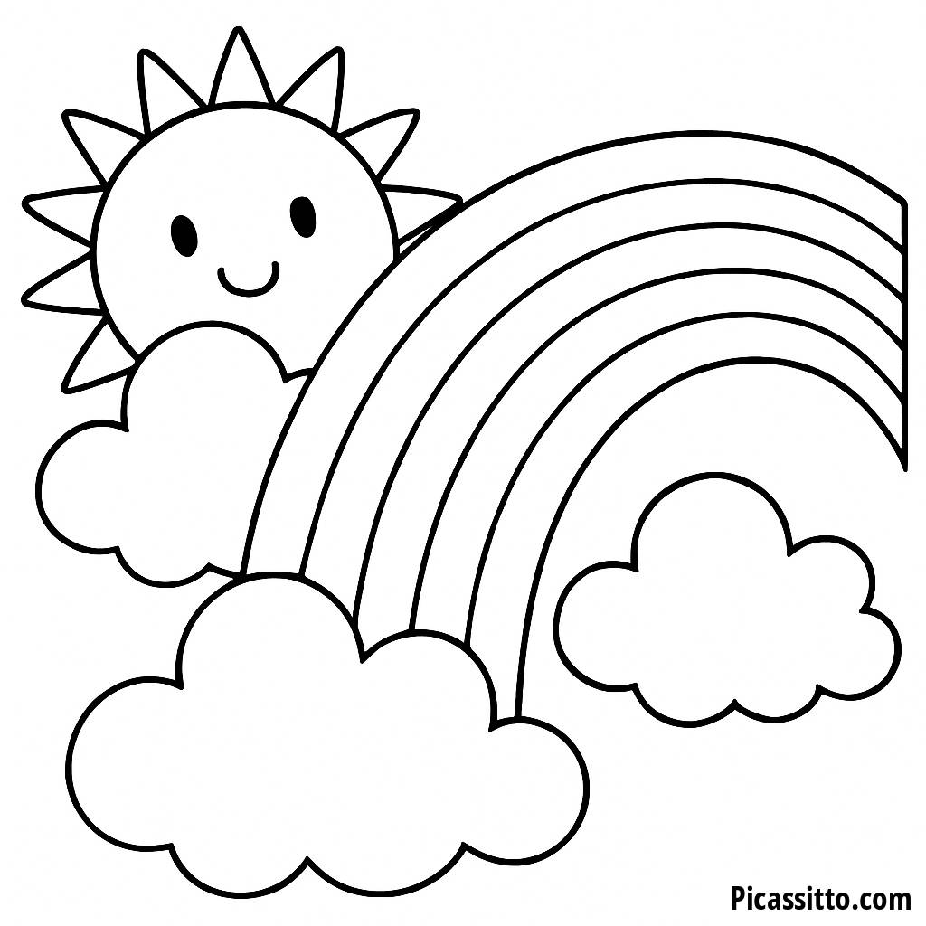 Enjoy this free and printable coloring page featuring a smiling sun peeking from behind fluffy clouds with a vibrant rainbow. Perfect for kids to unleash their creativity!