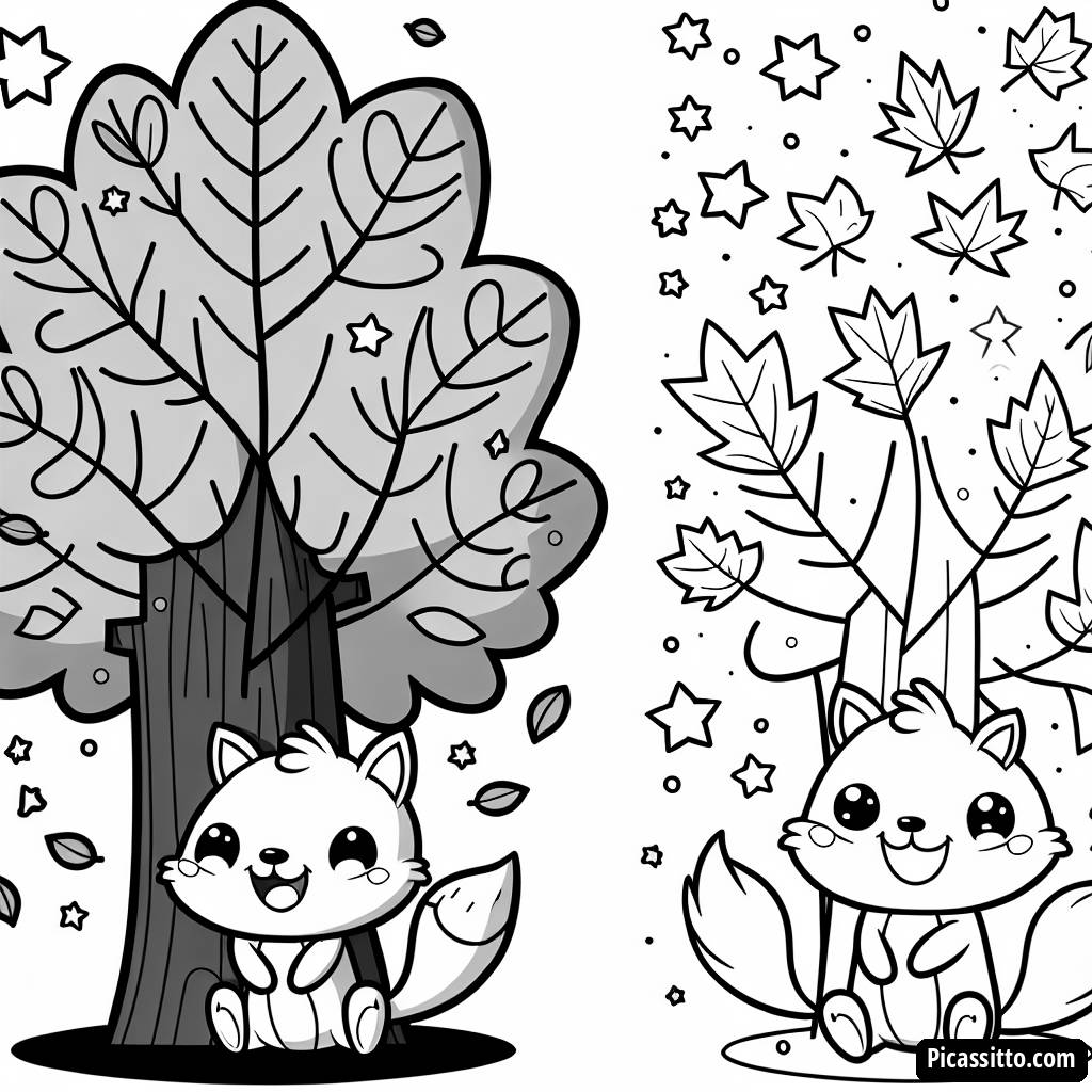 Enjoy this free and printable coloring page featuring a cartoonish maple tree, falling star-shaped leaves, and a happy squirrel. Perfect for a creative day at home!