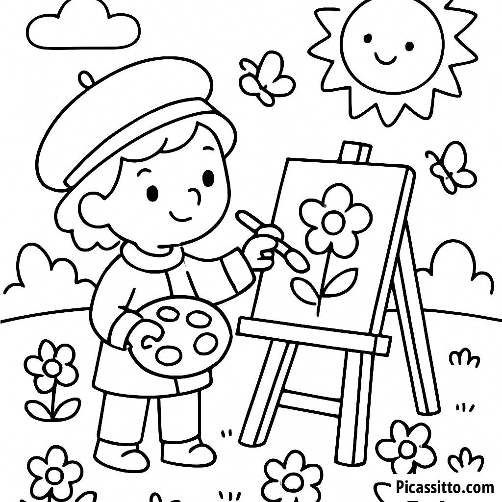 Download this free and printable coloring page featuring an artist painting in a sunny park surrounded by colorful flowers and butterflies.