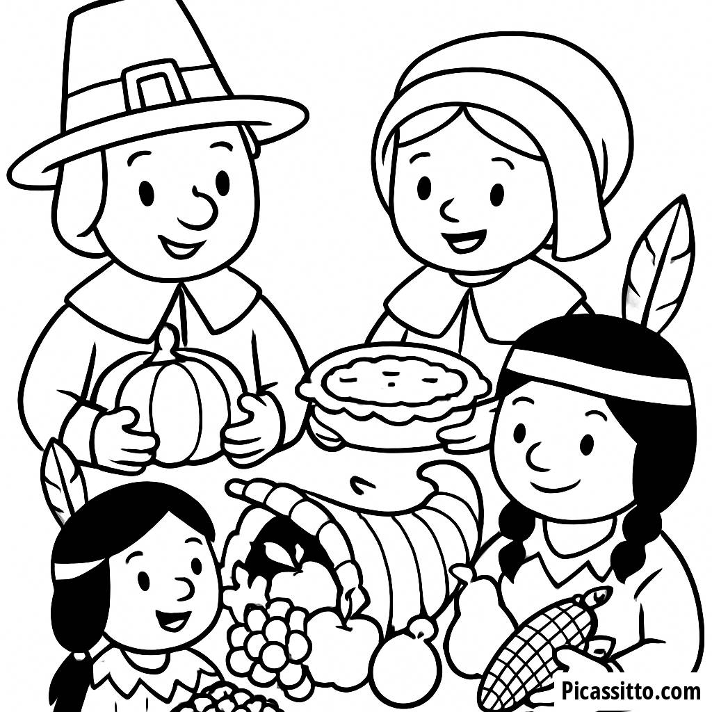 Thanksgiving Coloring Page: Pilgrims and Native Americans Sharing a Feast