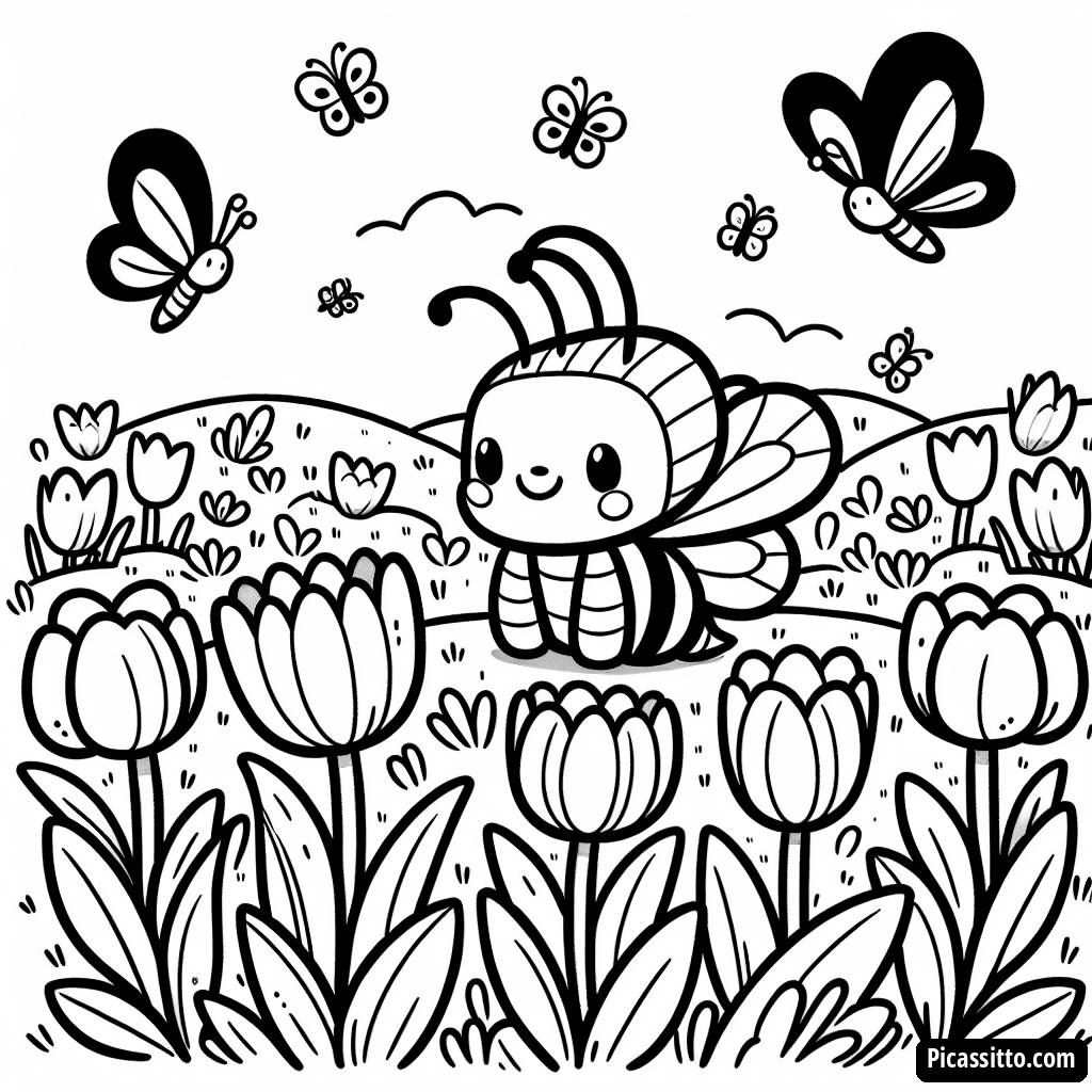 Enjoy a magical day in a whimsical flower field filled with tulips, butterflies, and a friendly buzzing bee! This coloring page is free and printable for hours of fun.