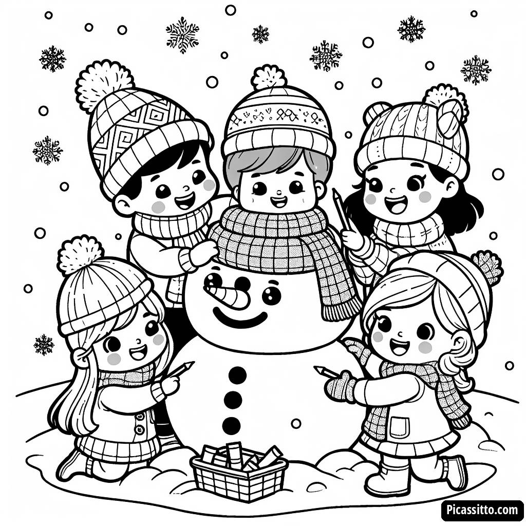 Enjoy this free printable coloring page of children building a snowman with snowflakes falling all around! Perfect for winter fun!