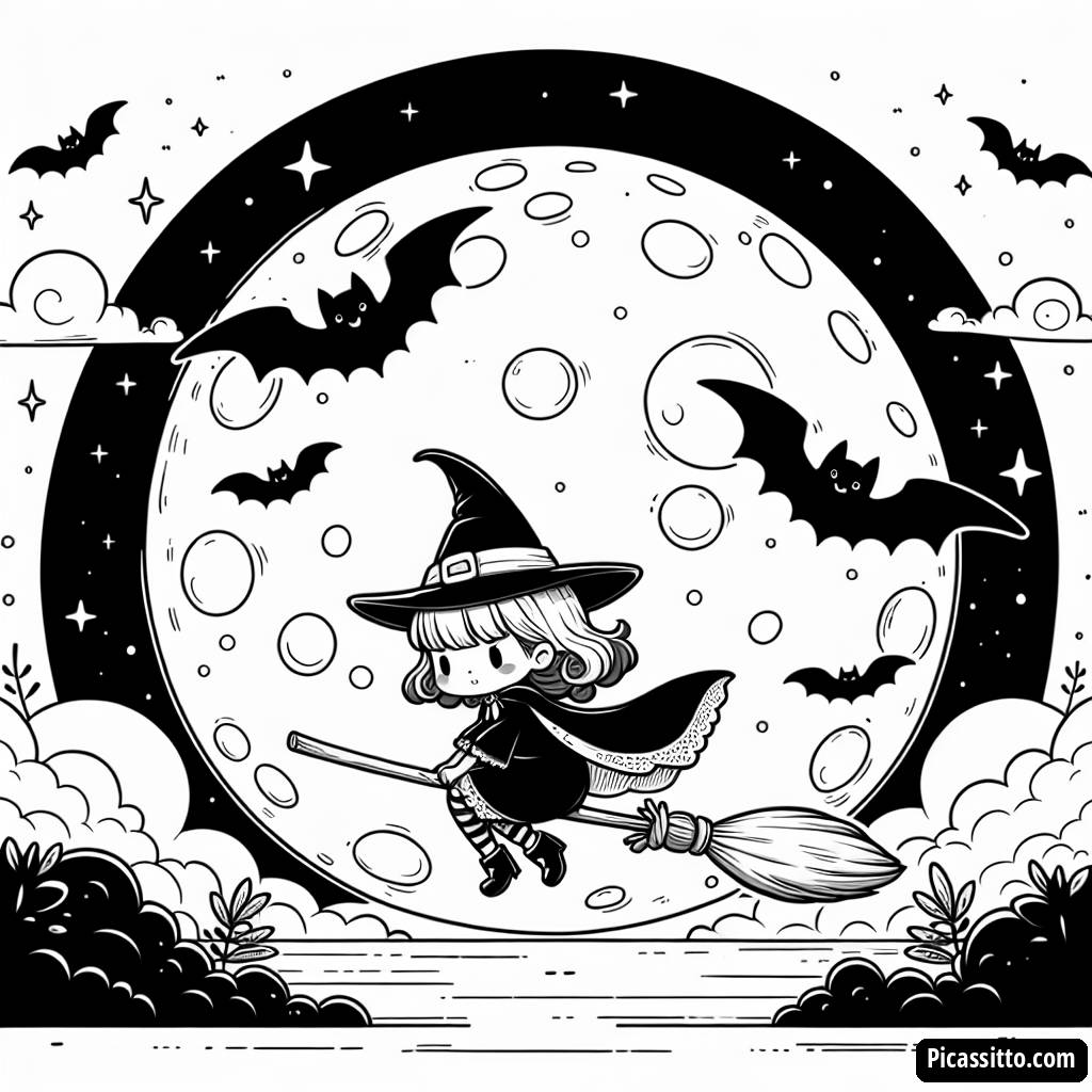 Enjoy this free and printable witch on a broomstick coloring page, perfect for Halloween fun! Let your imagination soar as you color her flying across a full moon with playful bats.