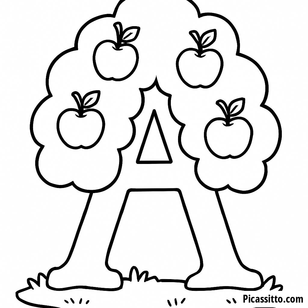 Descarga esta página para colorear gratis y imprimible con la letra 'A' en forma de manzano, llena de deliciosas manzanas. ¡Ideal para que los niños aprendan mientras se divierten!