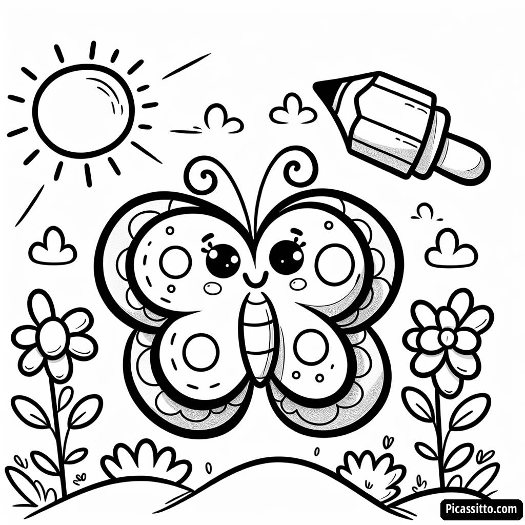 Descarga esta página para colorear gratuita y imprimible de la letra B y una mariposa rodeada de flores y sol. ¡Perfecta para los niños que aman colorear!