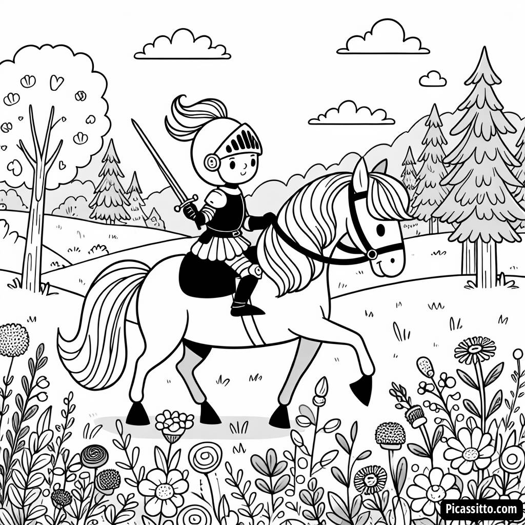 Descarga esta página para colorear gratuita y imprimible de un valiente caballero montando un caballo a través de un hermoso prado de flores silvestres. ¡Perfecto para jóvenes artistas que aman los cuentos de hadas!