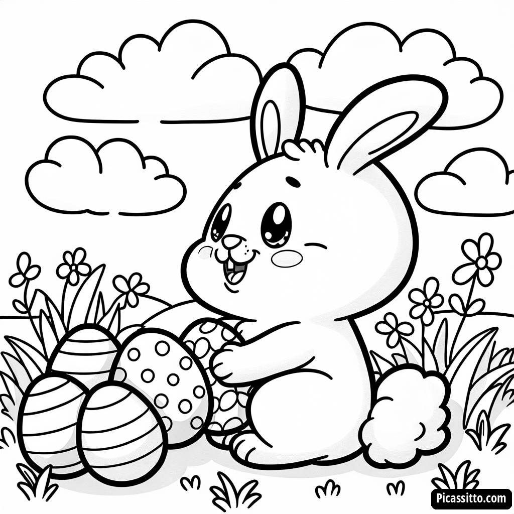 Descarga esta página para colorear gratuita de un conejito feliz escondiendo huevos coloridos en el césped. ¡Perfecta para la diversión de Pascua!