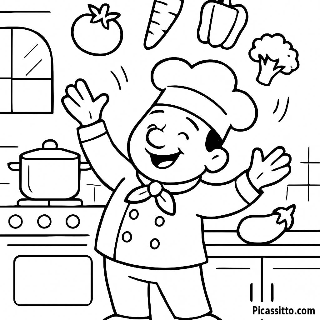 Descarga esta página para colorear del chef alegre, ¡perfecta para los niños que aman cocinar y divertirse! Deja que tu creatividad brille mientras coloreas a un chef que juggla coloridos vegetales en una cocina brillante.