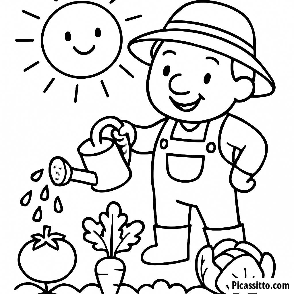 Disfruta de esta página para colorear gratuita y imprimible que presenta a un agricultor alegre regando coloridas plantas de verduras bajo un brillante sol.