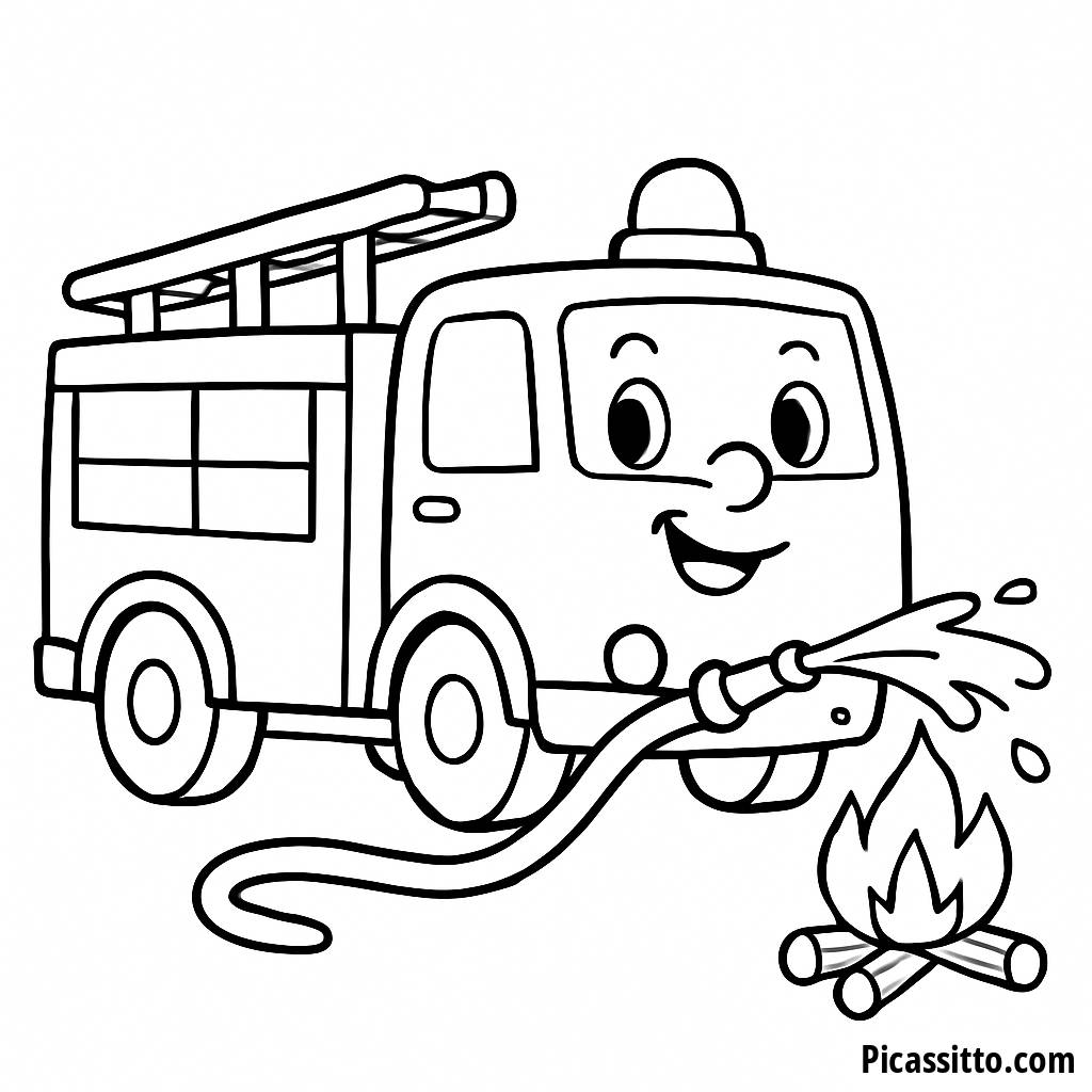 Descarga esta página para colorear gratuita de un alegre camión de bomberos rociando agua sobre una pequeña fogata. ¡Perfecta para niños que aman los vehículos!