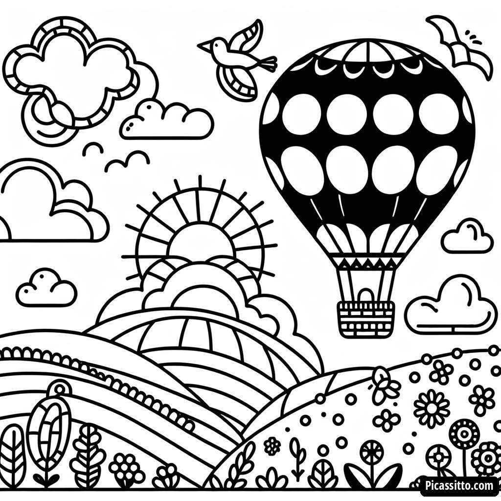 Descarga e imprime esta página para colorear de globo aerostático alegre de forma gratuita, perfecta para inspirar la creatividad en los niños mientras colorean un hermoso paisaje lleno de nubes y pájaros.