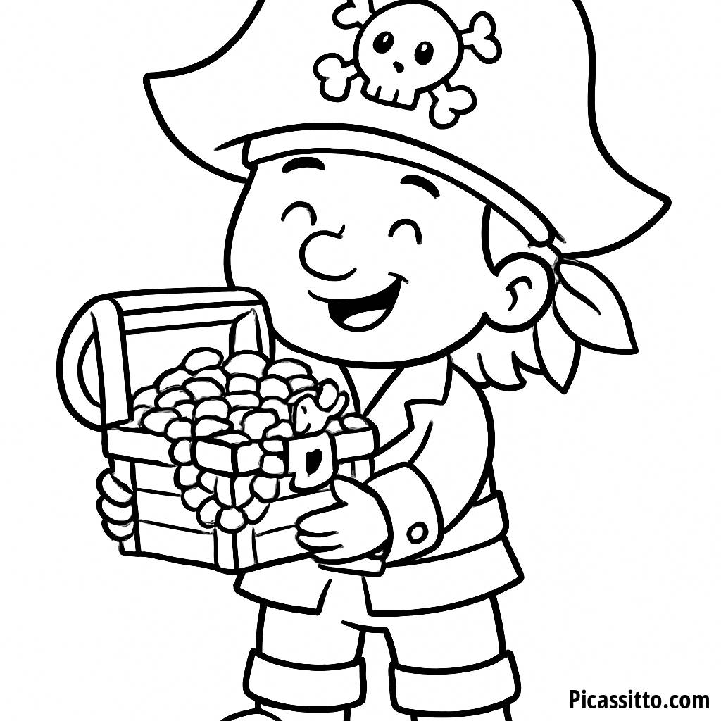 Descarga esta página para colorear de un pirata alegre, que presenta a un pirata con un cofre del tesoro lleno de monedas de oro y joyas. ¡Es gratis y perfecta para los niños que aman la aventura!
