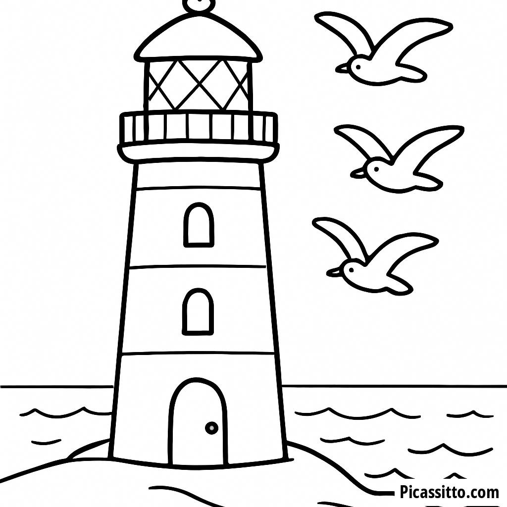 Disfruta de esta página para colorear gratuita y imprimible que presenta un majestuoso faro junto al océano con gaviotas volando alrededor. ¡Perfecta para los pequeños artistas que aman las escenas costeras!