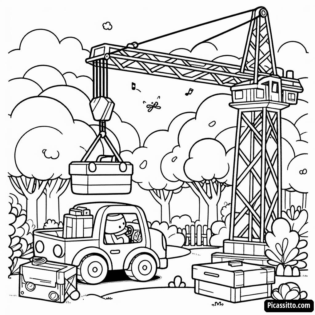 Página para Colorear: Colorido Sitio de Construcción con una Grúa y Caja de Herramientas Roja