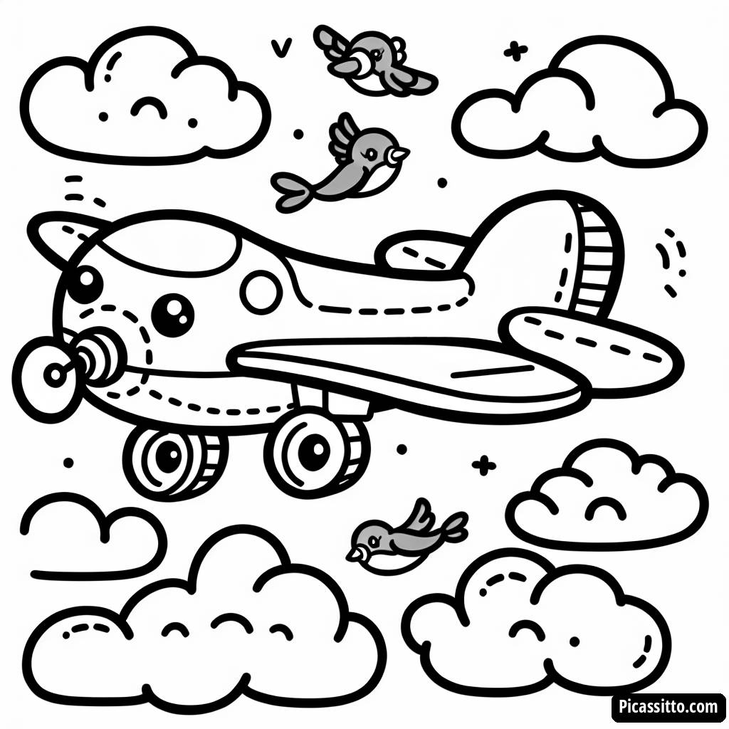 Disfruta de esta página para colorear de un avión adorable, ¡gratis y imprimible! Deja volar tu imaginación mientras coloreas nubes esponjosas y felices pájaros.