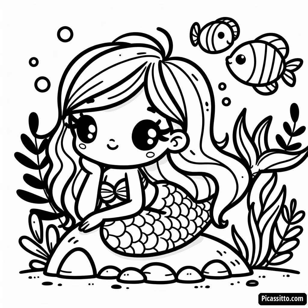 Sumérgete en la creatividad con nuestra página para colorear de sirena encantadora, gratuita e imprimible, que presenta a una hermosa sirena descansando en una roca rodeada de peces coloridos y algas.