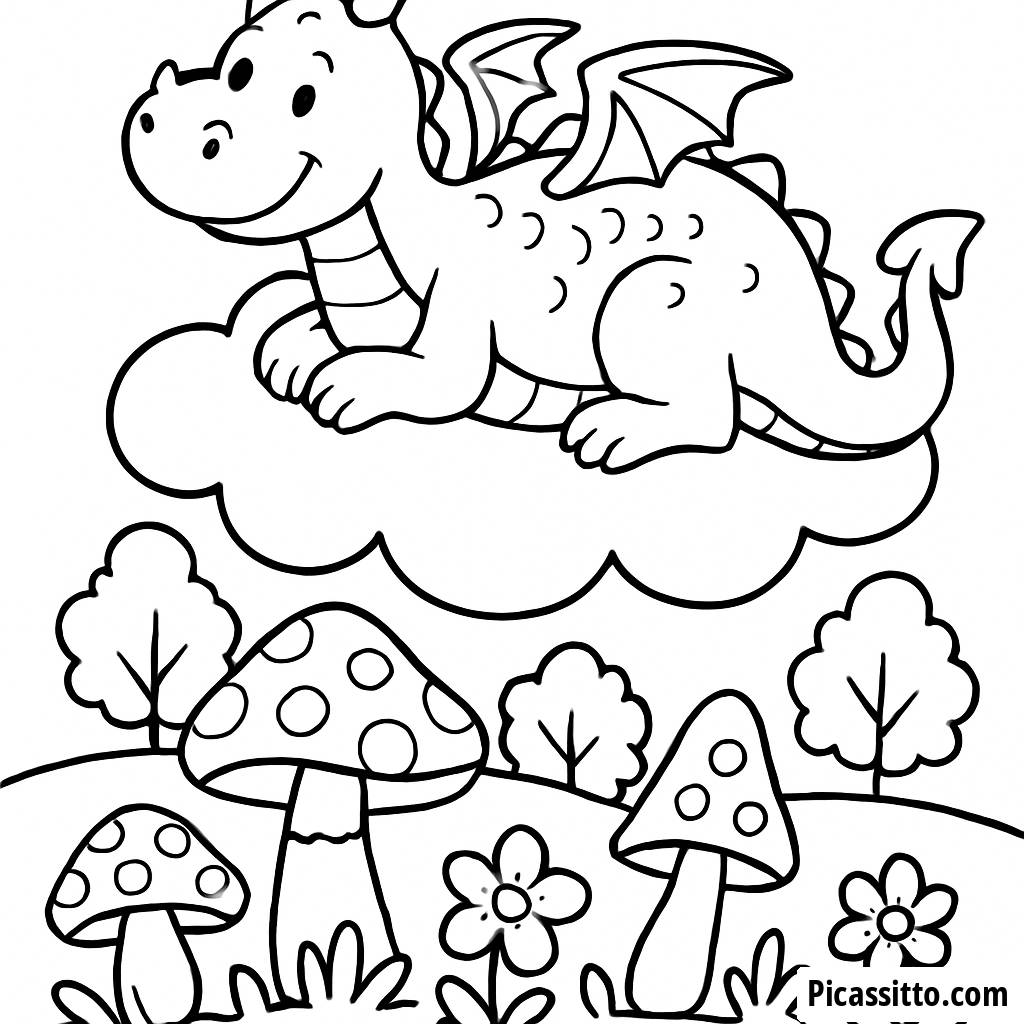 Esta página para colorear gratuita y imprimible presenta un dragón amistoso descansando en una nube sobre un bosque caprichoso lleno de hongos y flores. ¡Perfecta para artistas jóvenes!