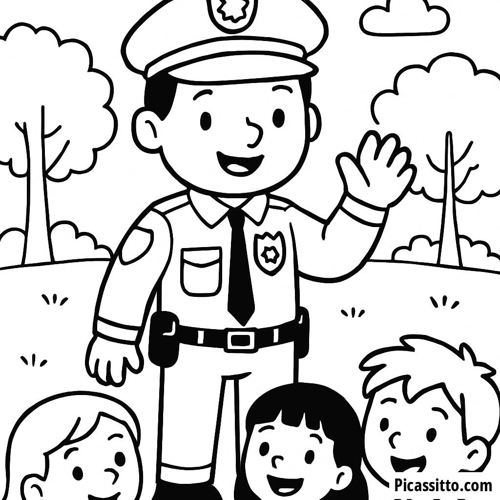 Descarga esta página para colorear gratuita y imprimible de un policía amigable saludando a los niños en un parque. ¡Ideal para fomentar la creatividad y el aprendizaje divertido!