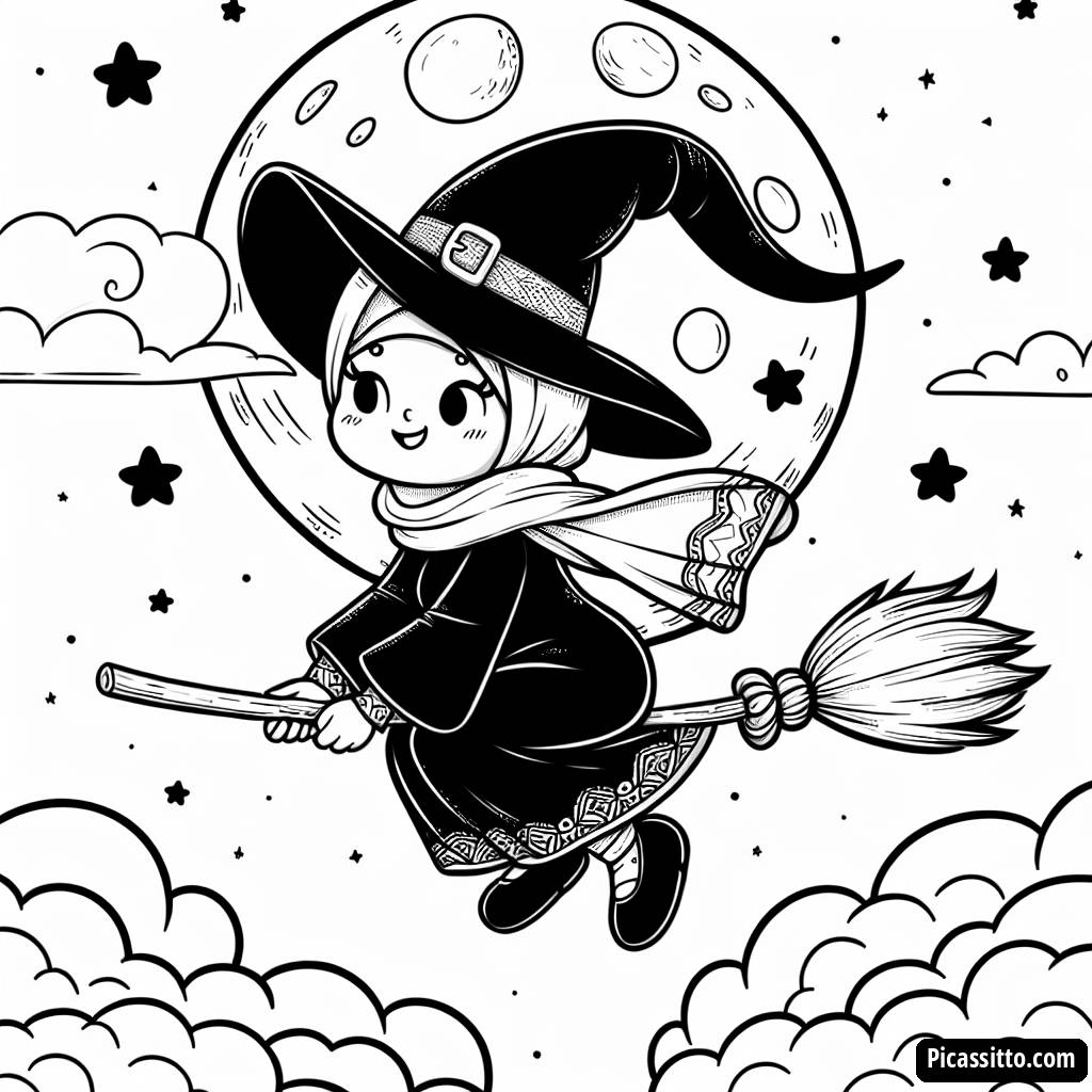 Descarga esta página para colorear de la bruja amistosa, ¡gratis y imprimible, perfecta para la diversión de Halloween bajo la luna llena!