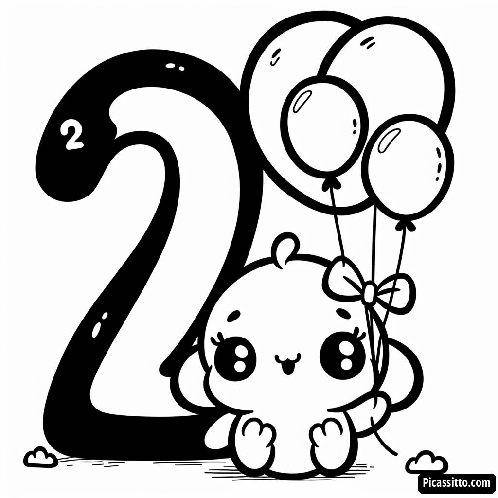 Descarga esta página para colorear gratis e imprimible que presenta el número 2 con dos globos alegres flotando sobre él. ¡Perfecta para que los niños practiquen sus números mientras se divierten!