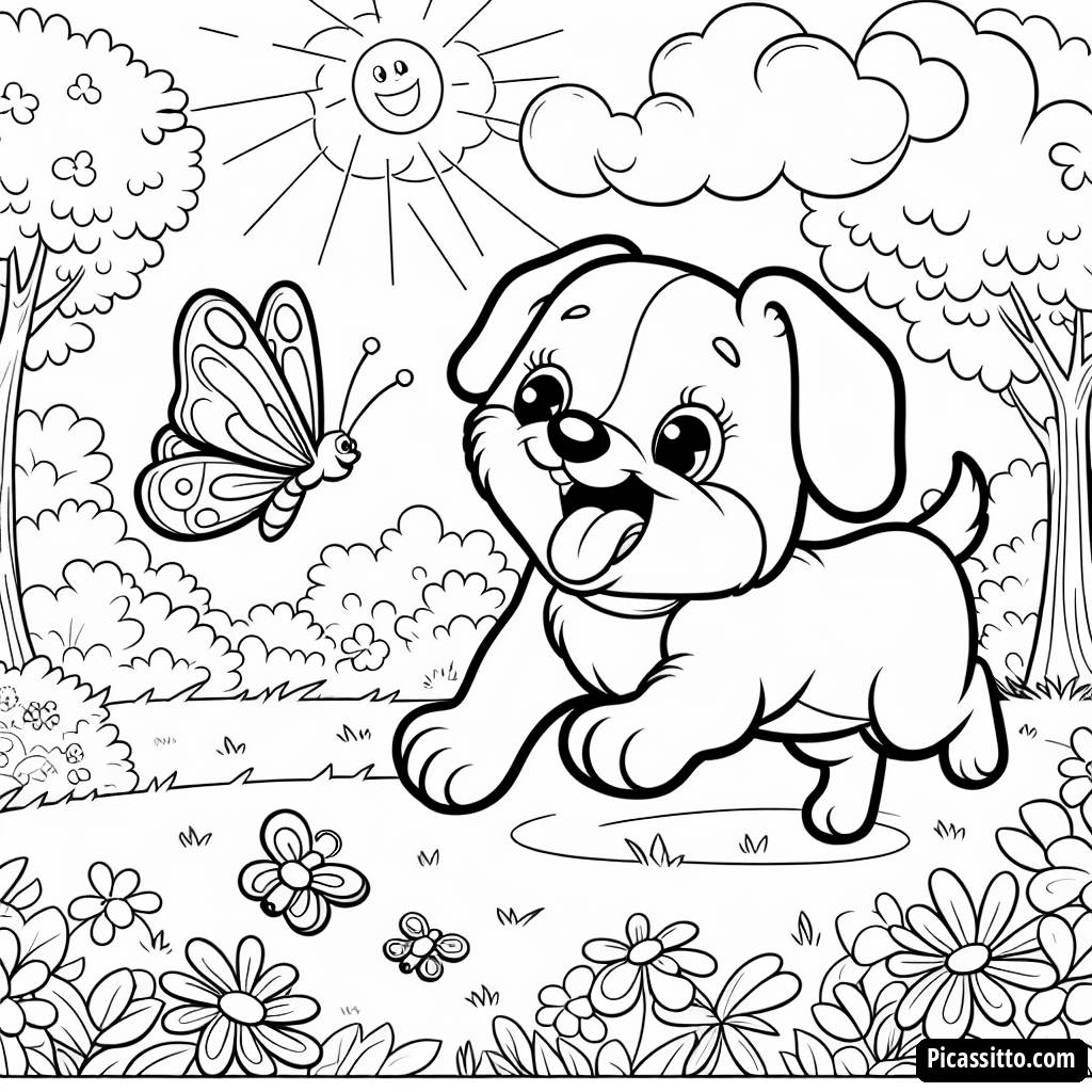 Descarga esta página para colorear gratuita e imprimible de un cachorro juguetón persiguiendo una mariposa en un parque soleado, ¡perfecta para pequeños artistas!