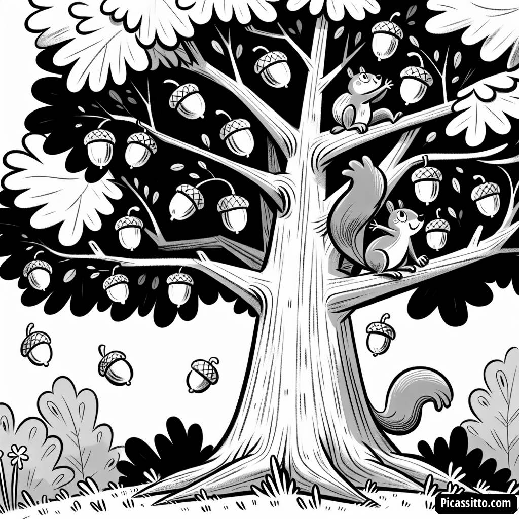 Descarga esta página para colorear gratis, que presenta un alto roble, bellotas y una ardilla juguetona trepando. ¡Perfecto para los niños que aman la naturaleza!