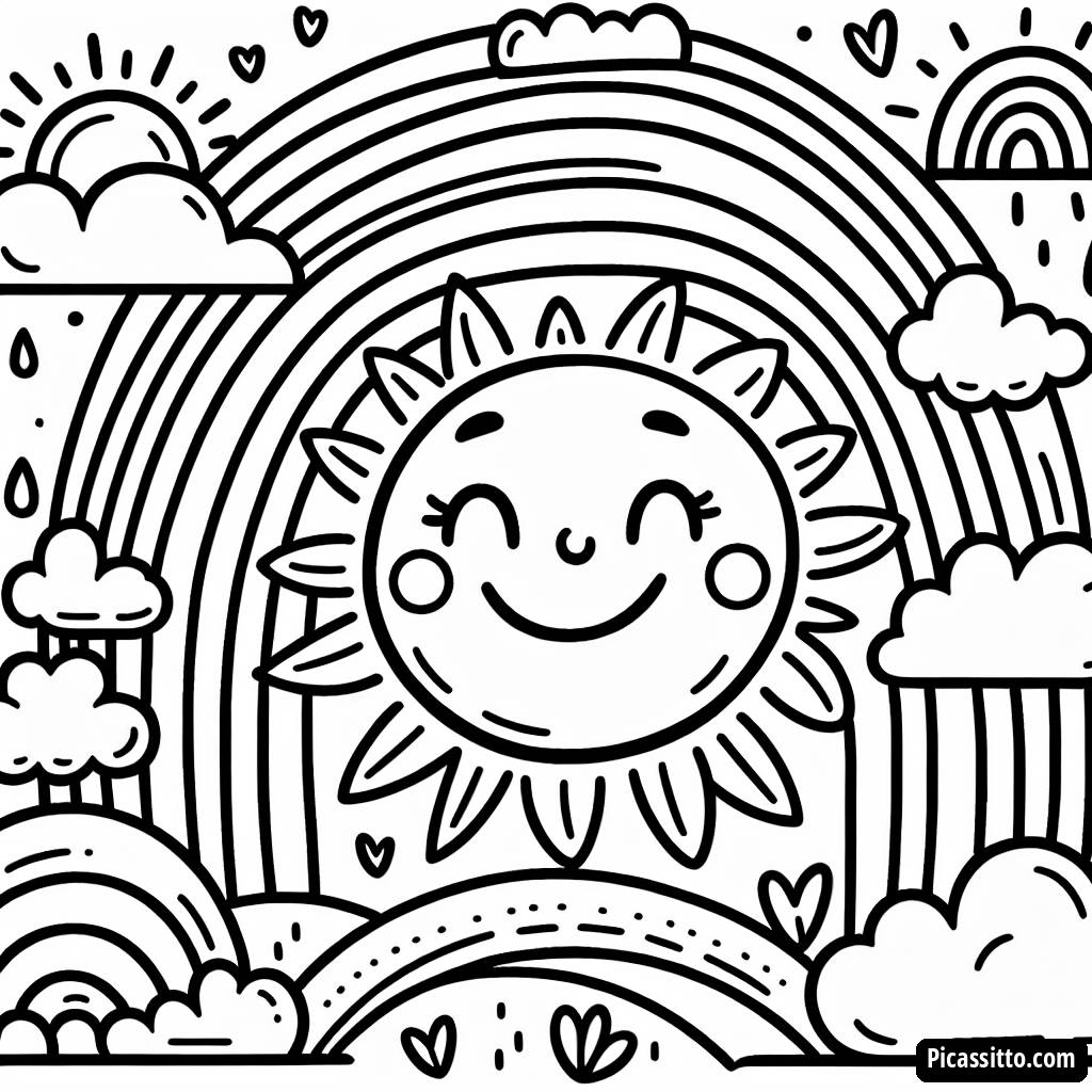 Disfruta de esta página para colorear gratuita y imprimible que presenta un gran sol sonriente, nubes esponjosas y un vibrante arcoíris. ¡Perfecta para iluminar tu día!