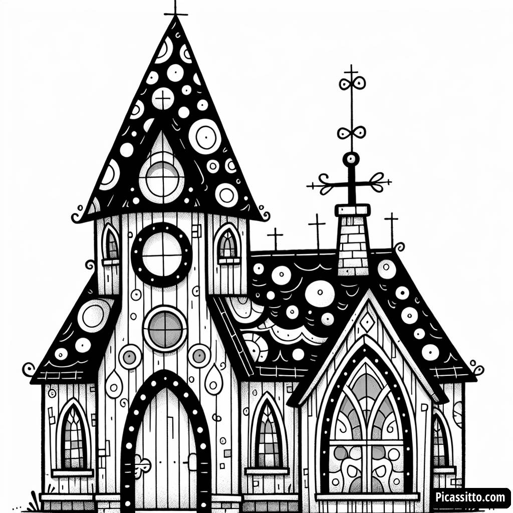 Descarga esta página para colorear de una iglesia fantástica, gratuita y imprimible, con un alto campanario y hermosas vidrieras para horas de diversión creativa.