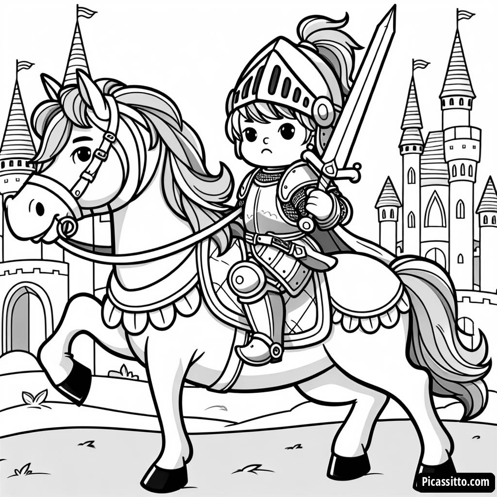 Téléchargez cette page à colorier gratuite et imprimable représentant un chevalier courageux sur son cheval avec un château en arrière-plan.