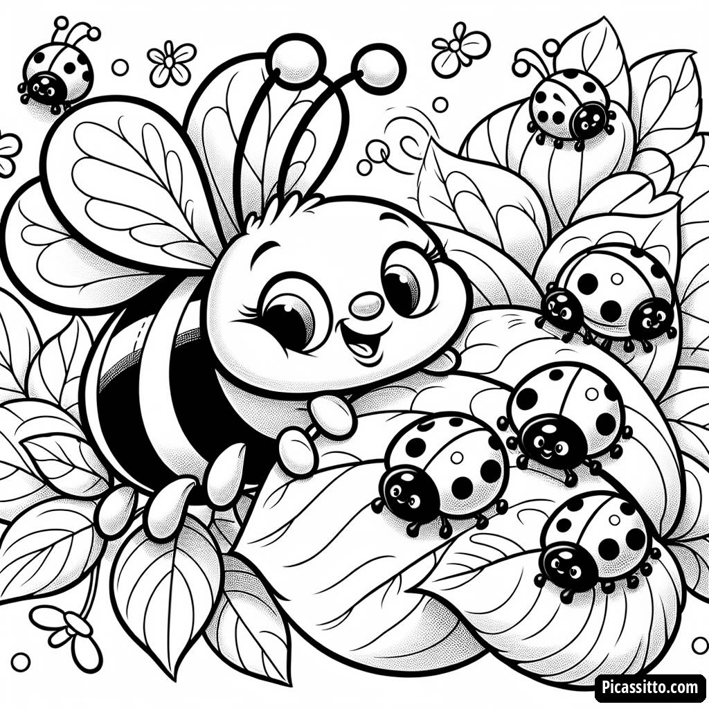 Téléchargez cette page à colorier gratuite et imprimable avec une abeille joyeuse volant autour de coccinelles colorées sur une feuille. Idéale pour les jeunes artistes passionnés d'insectes !