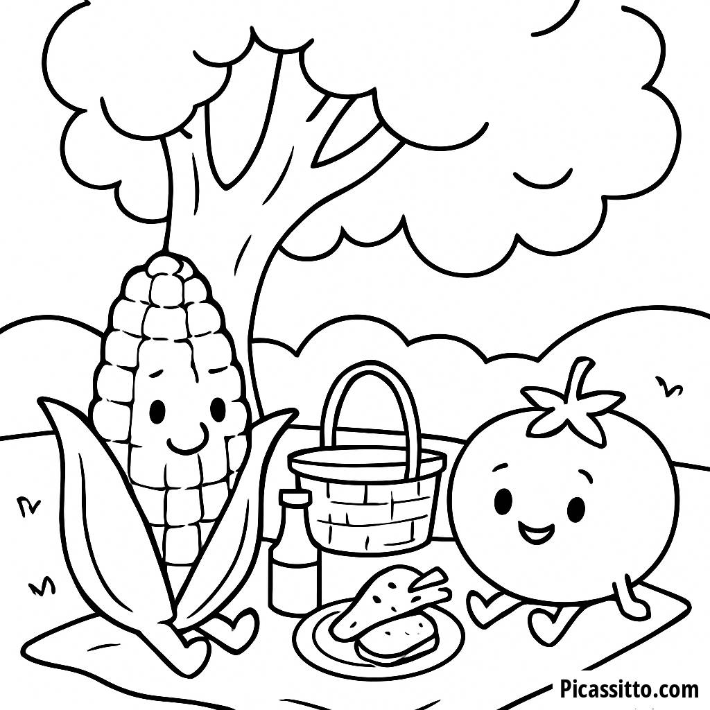 Profitez de cette page à colorier gratuite et imprimable avec un joyeux épi de maïs et une tomate ayant un pique-nique sous un grand arbre. Parfait pour les petits artistes qui adorent les légumes!