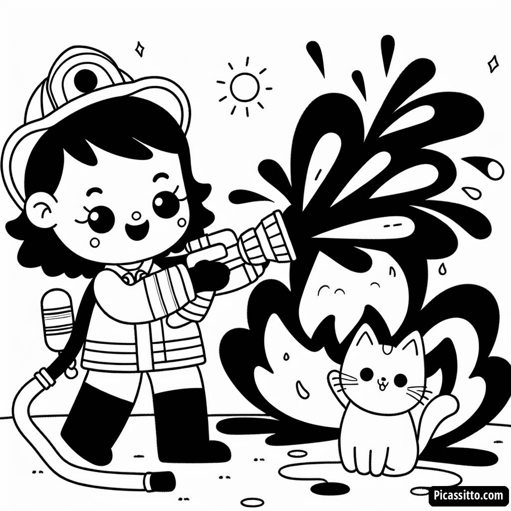 Téléchargez cette page à colorier gratuite et imprimable d'un pompier joyeux, représentant un pompier courageux arrosant un feu de dessin animé avec un chat heureux à proximité !