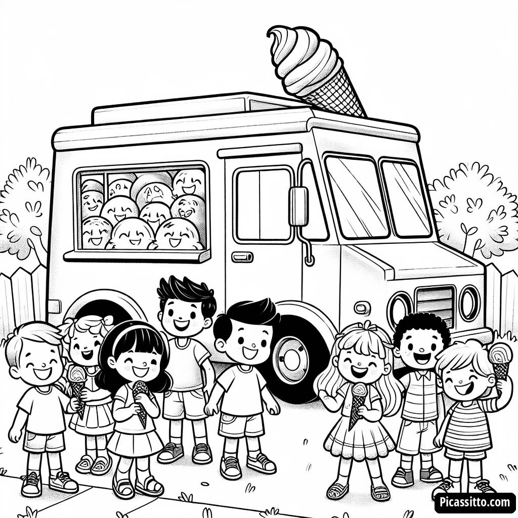 Profitez d'une journée amusante avec notre page à colorier gratuite d'un camion de glaces coloré entouré d'enfants heureux !