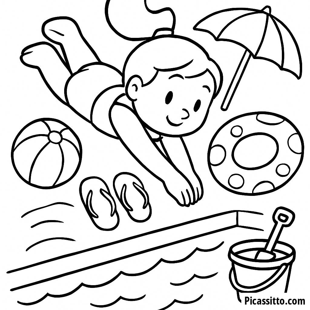 Profitez de cette page à colorier gratuite et imprimable d'une fille plongeant dans une piscine cristalline, entourée d'objets de plage colorés. Parfaite pour les petits artistes qui adorent l'été !