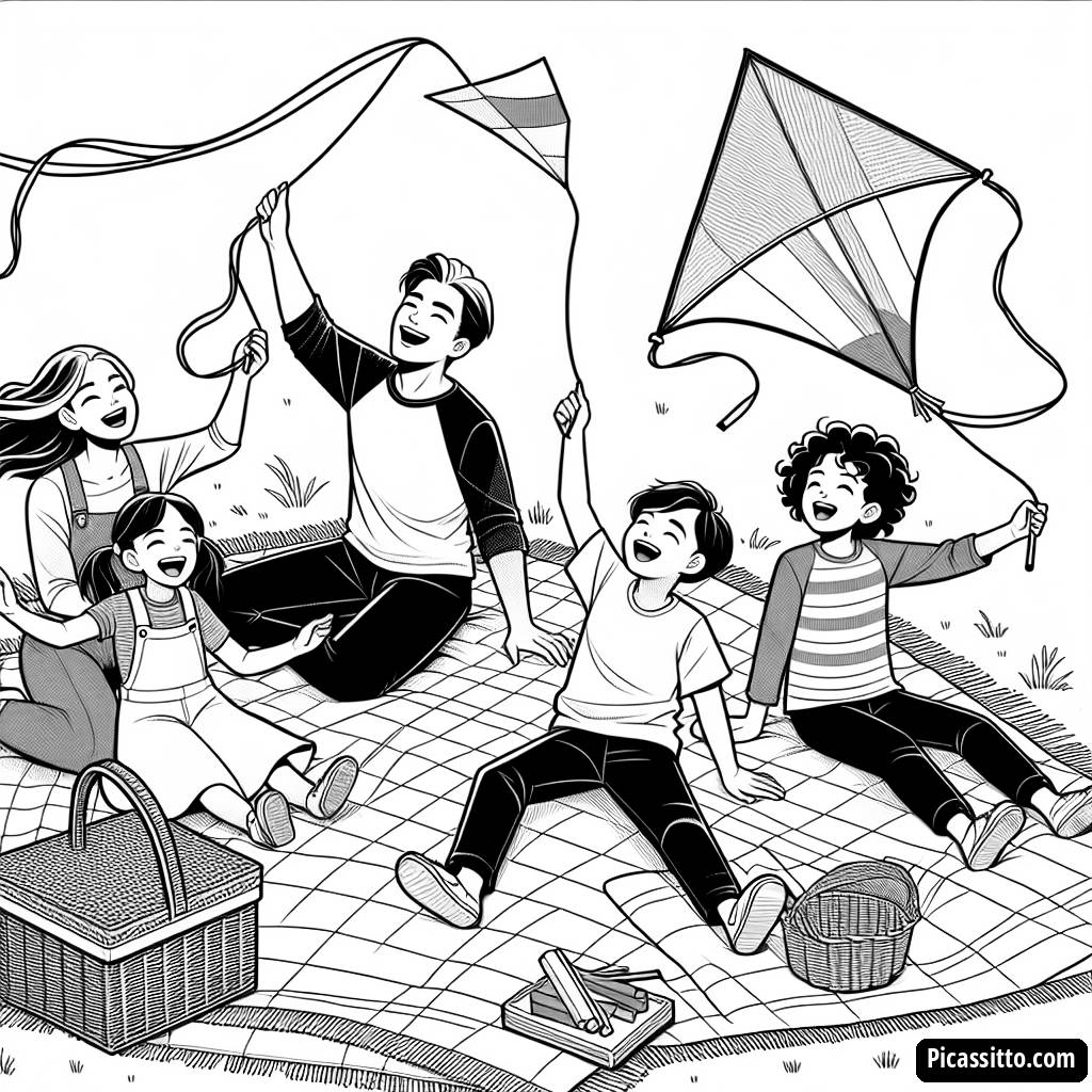 Profitez d'une journée délicieuse avec notre page à colorier pique-nique en famille gratuite, présentant une couverture, un panier et des enfants faisant voler des cerfs-volants !
