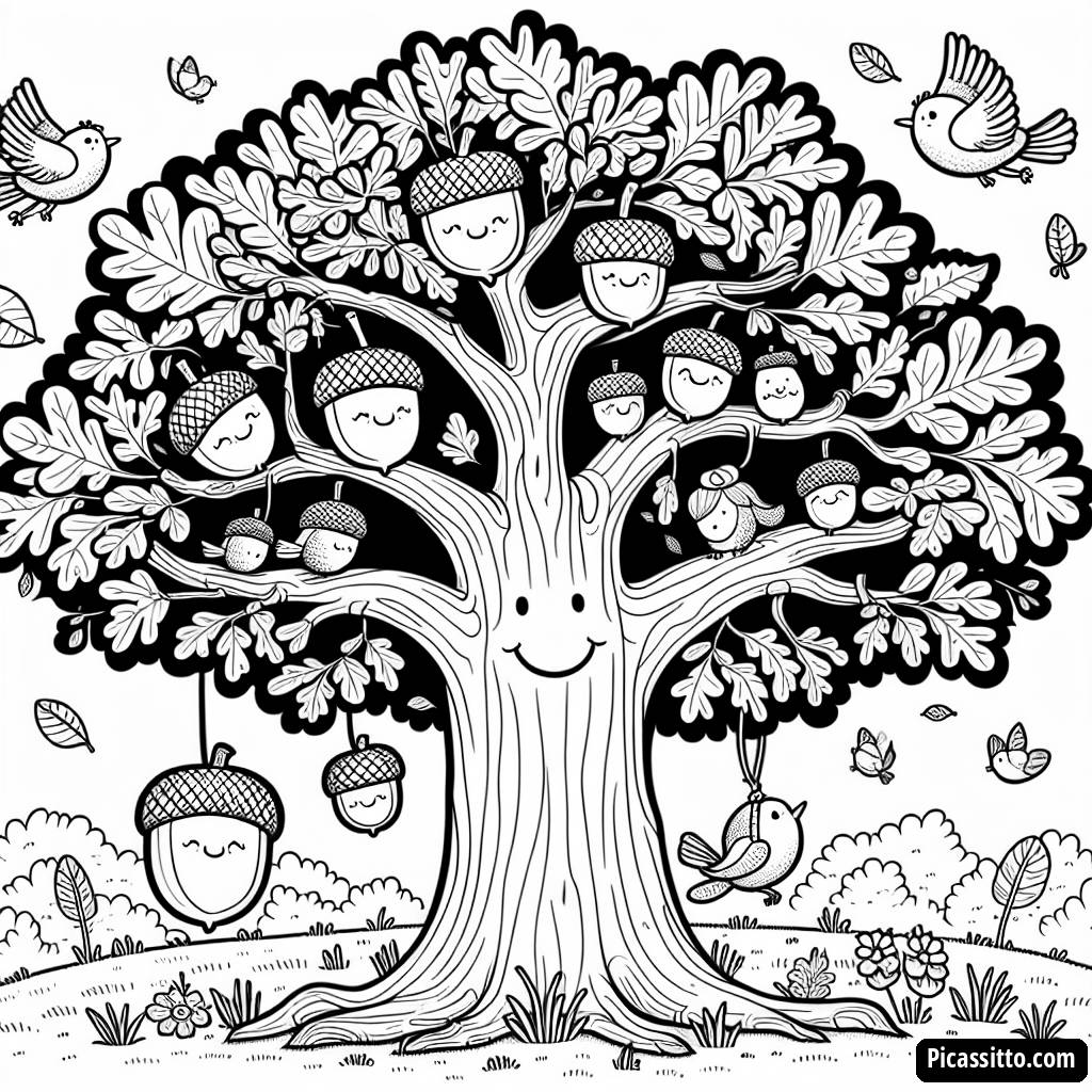 Profitez de cette page de coloriage gratuite et imprimable d'un chêne amical, avec des glands souriants et des oiseaux joyeux ! Parfait pour les enfants qui aiment la nature.