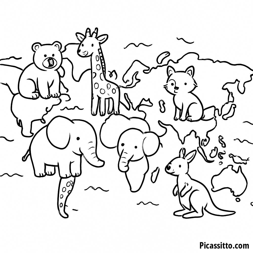 Explorez les continents avec notre page à colorier gratuite et imprimable du monde, mettant en vedette d'adorables animaux de dessin animé représentant chaque région !