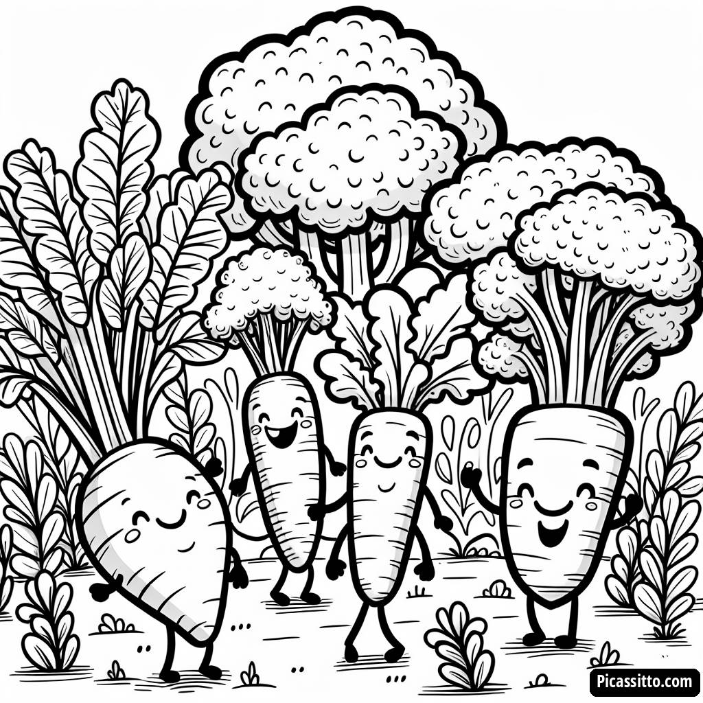 Profitez de cette page à colorier gratuite et imprimable, mettant en scène un jardin de légumes heureux avec des carottes souriantes et des brocolis dansant ensemble !