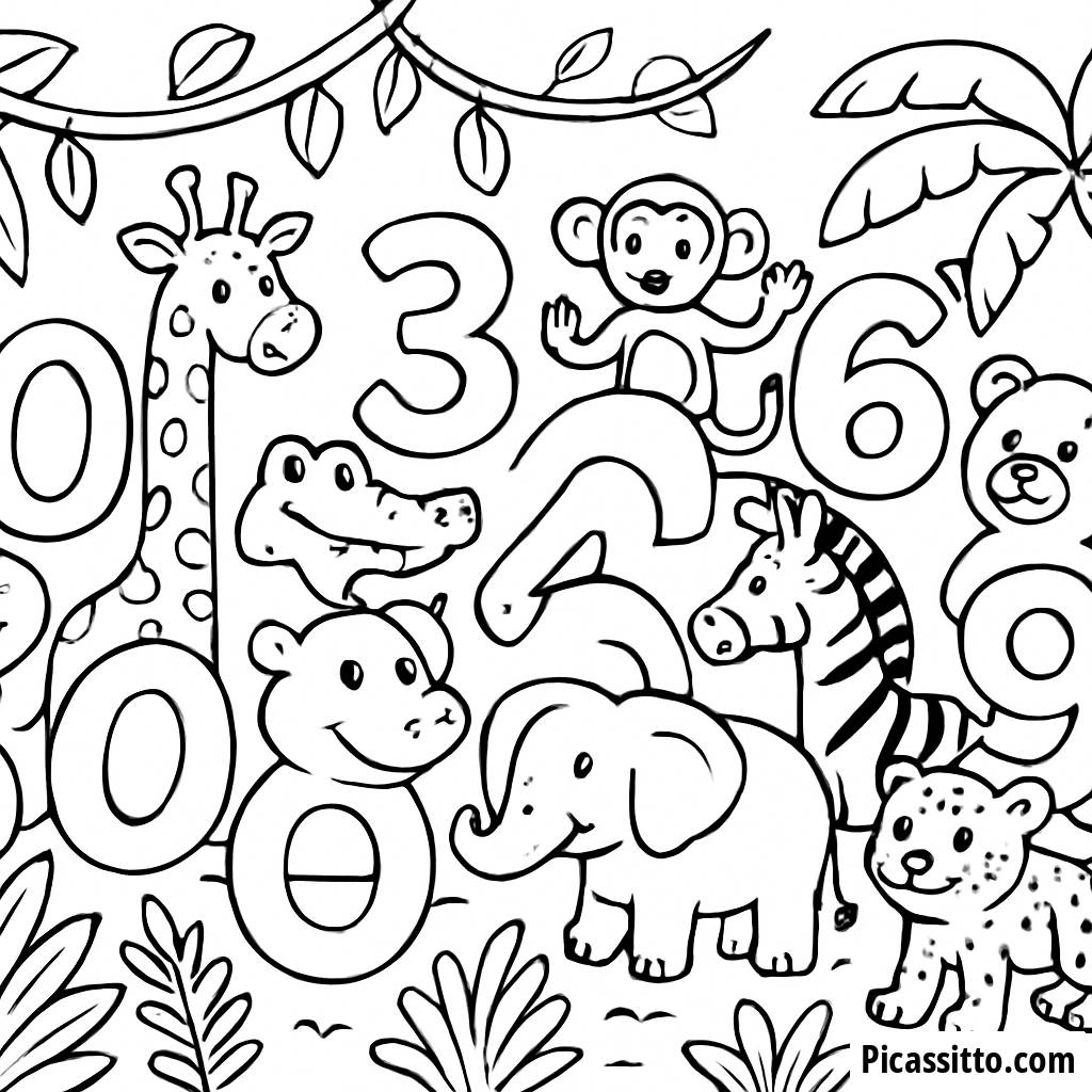 Découvrez le monde amusant des nombres avec notre page à colorier gratuite et imprimable dans la jungle, mettant en scène des versions amicales d'animaux des chiffres 0 à 9. Parfait pour les enfants créatifs qui adorent apprendre !