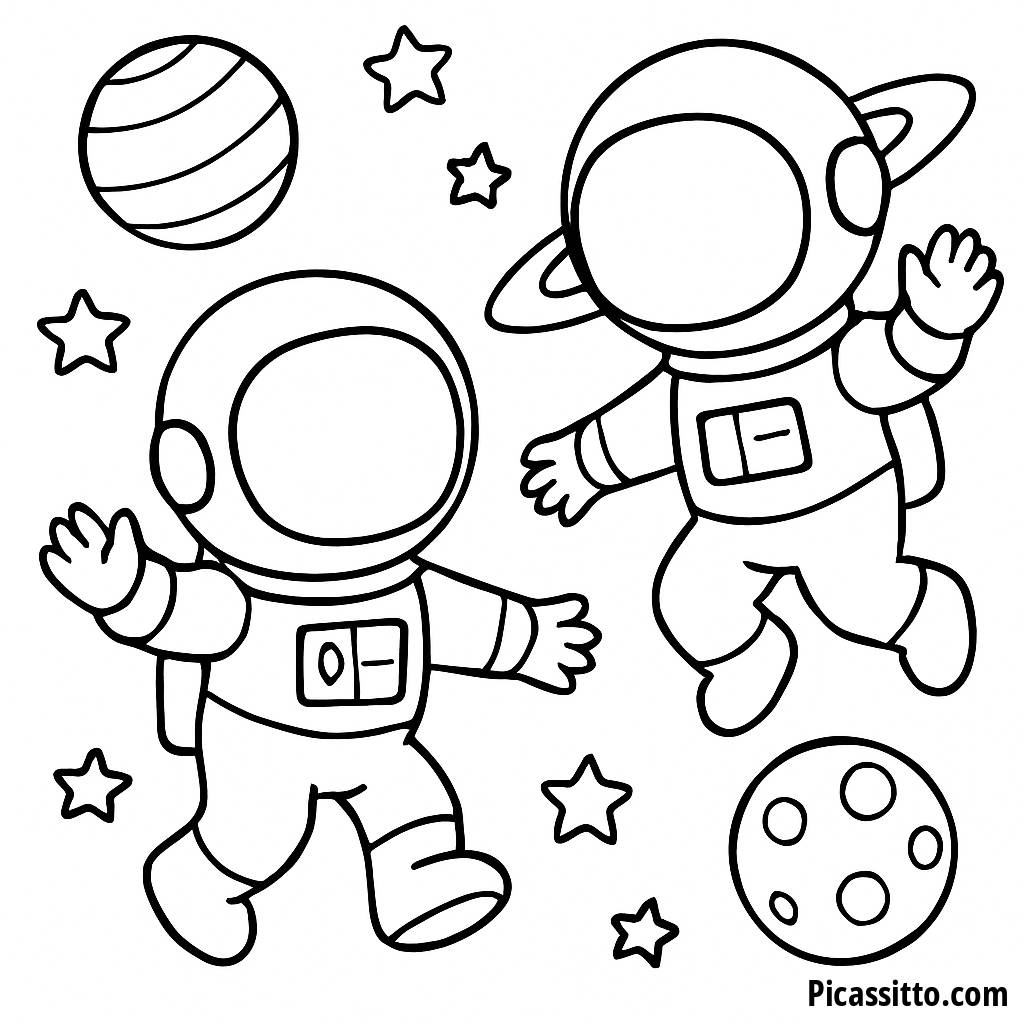 Explorez les merveilles de l'univers avec notre page à colorier d'astronautes, gratuite et imprimable, mettant en vedette deux astronautes flottant parmi des planètes colorées et des étoiles !