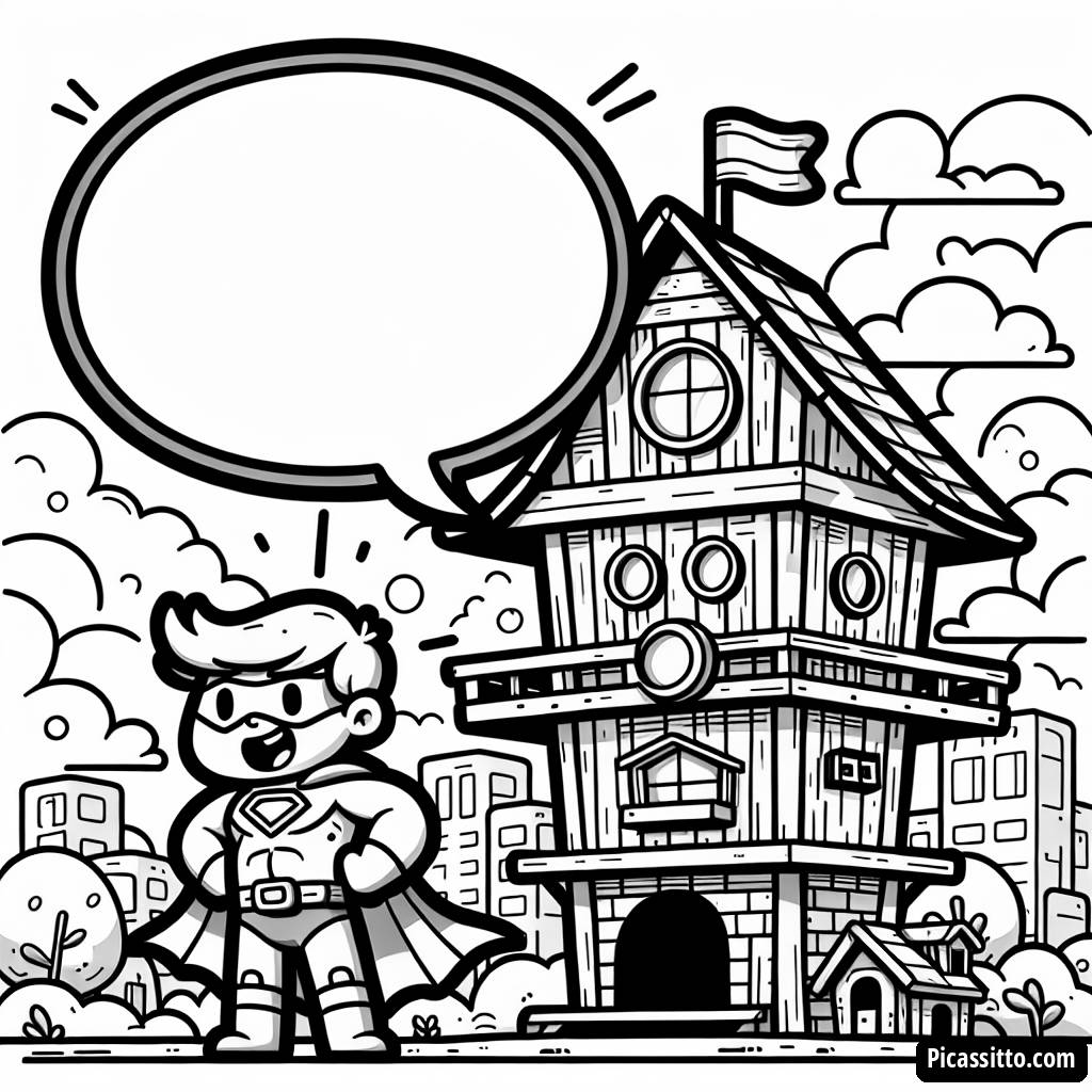 Téléchargez cette page à colorier gratuite et imprimable du Quartier Général des PJ Masks, avec un point de vue sur le toit et des bulles de dialogue amusantes au style bande dessinée pour vos petits héros !
