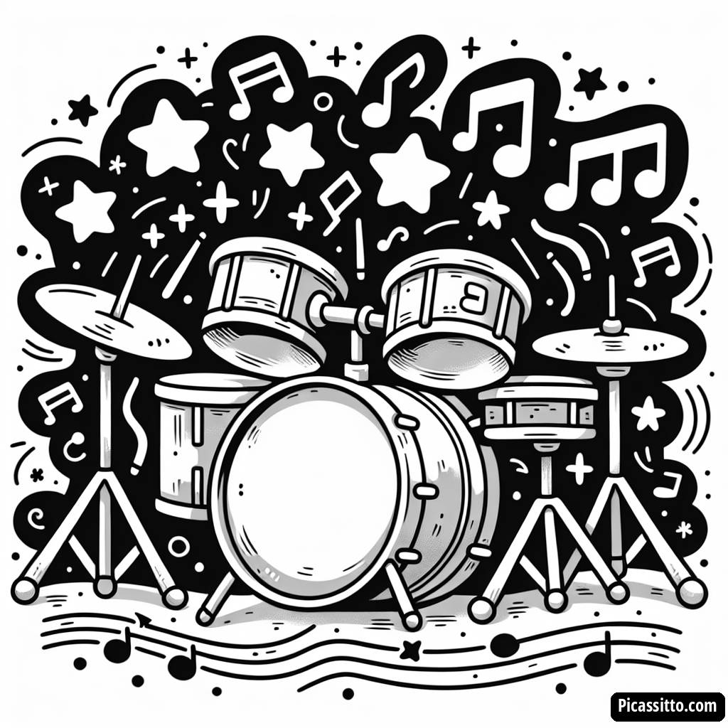 Préparez-vous à libérer votre créativité avec cette page à colorier de batterie gratuite et imprimable, ornée de notes de musique et d'étoiles dansantes !