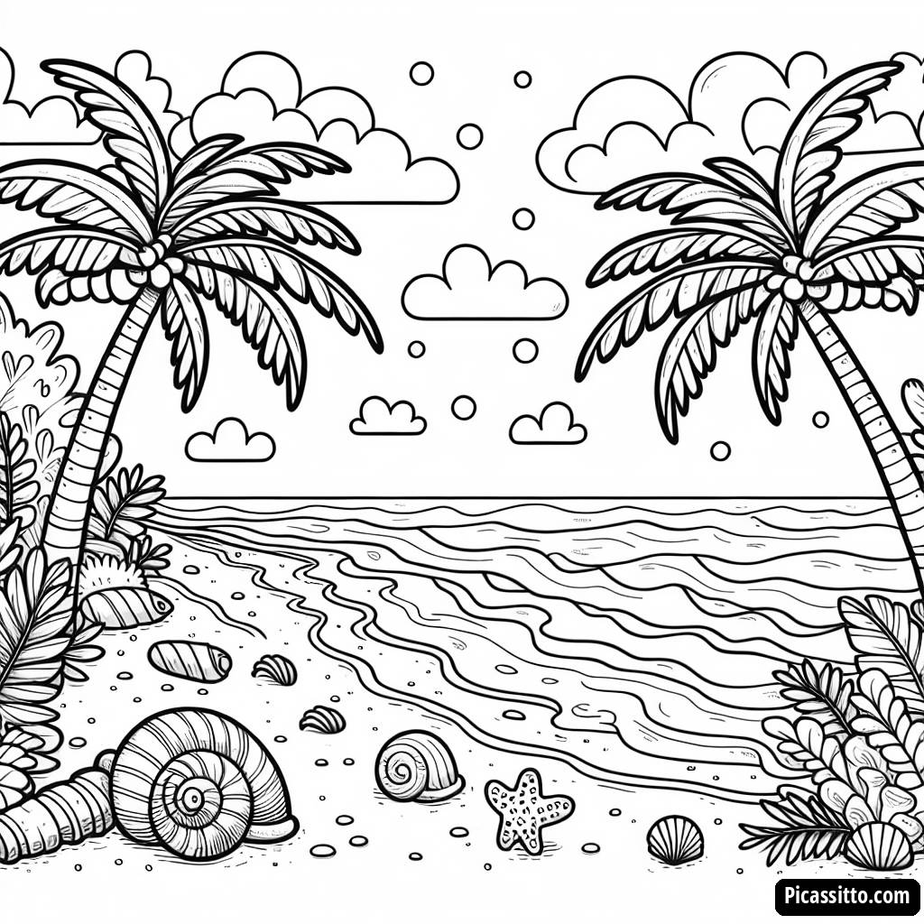 Profitez d'une journée amusante à la plage avec cette page à colorier gratuite et imprimable, mettant en vedette des palmiers, des coquillages et des vagues douces.