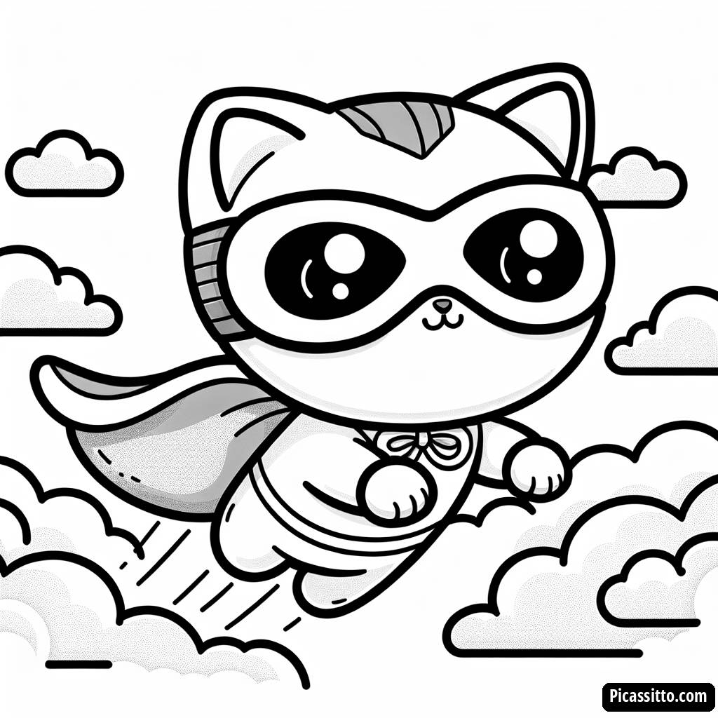 Libérez votre créativité avec notre page à colorier de Chaton Super-Héros, gratuite et imprimable ! Regardez ce chaton adorable voler à travers les nuages avec sa cape et son masque.