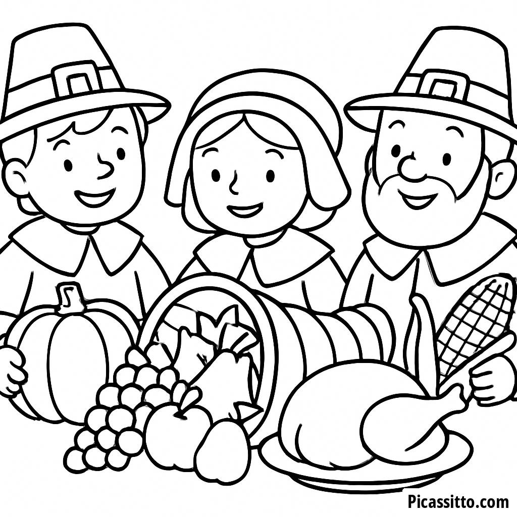Profitez de notre page à colorier gratuite et imprimable sur la fête de Thanksgiving, mettant en scène des pèlerins amicaux partageant une cornucopia débordante de fruits !