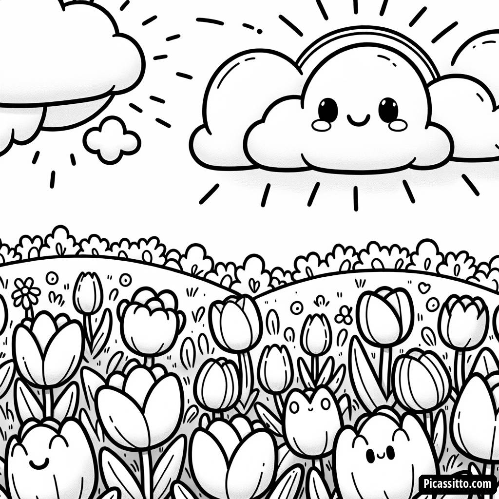 Profitez de cette page à colorier gratuite et imprimable d'un champ de tulipes fantaisiste, avec un soleil souriant et des nuages duveteux ! Parfait pour les enfants qui aiment les fleurs et la créativité.