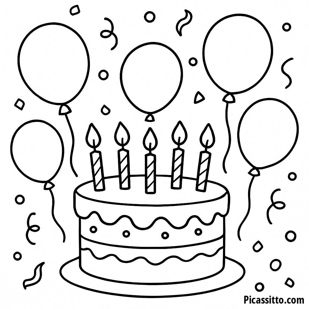 Festeggia con la nostra pagina da colorare gratuita e stampabile della torta di compleanno, con una grande torta con candele, palloncini colorati e coriandoli!