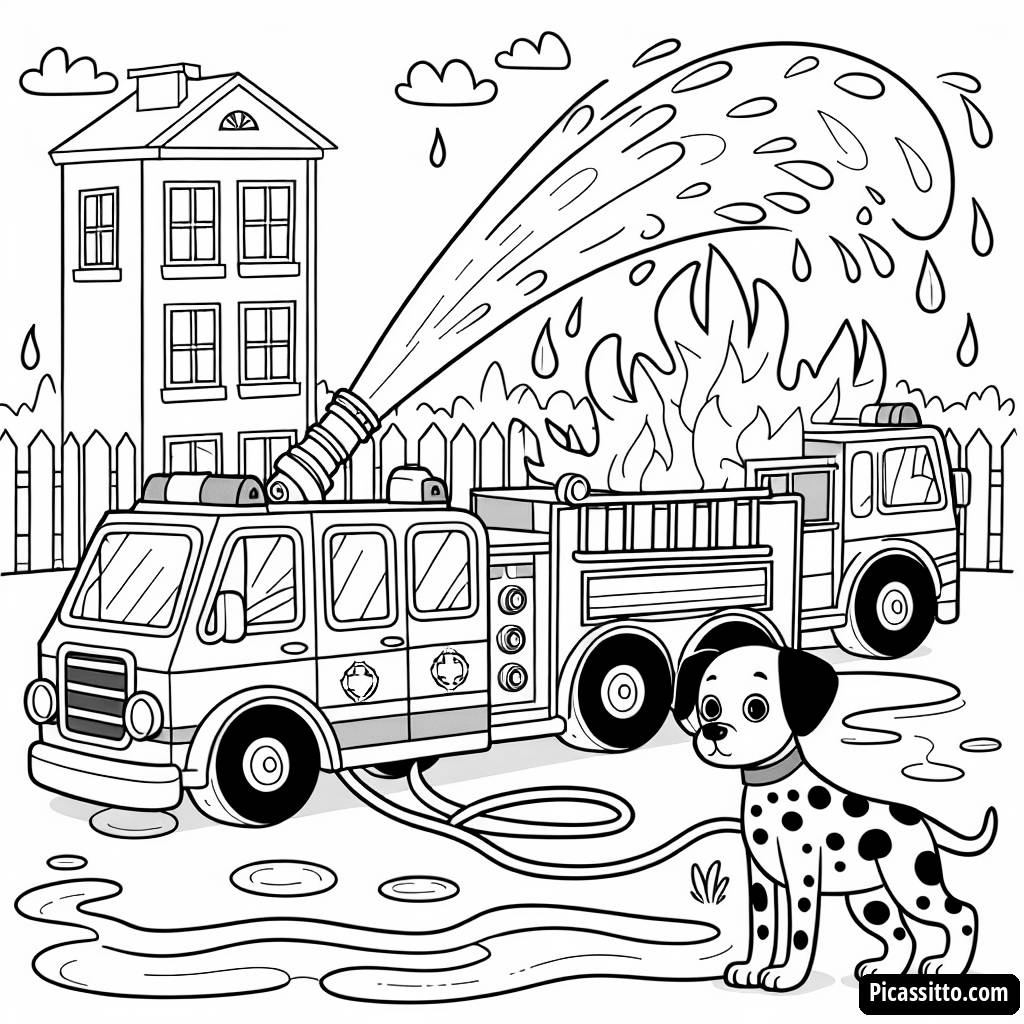 Scarica questa pagina da colorare gratuita con un coraggioso camion dei pompieri che spruzza acqua su un edificio in fiamme fittizio con un dalmata nelle vicinanze. Perfetta per i bambini che amano l'avventura!