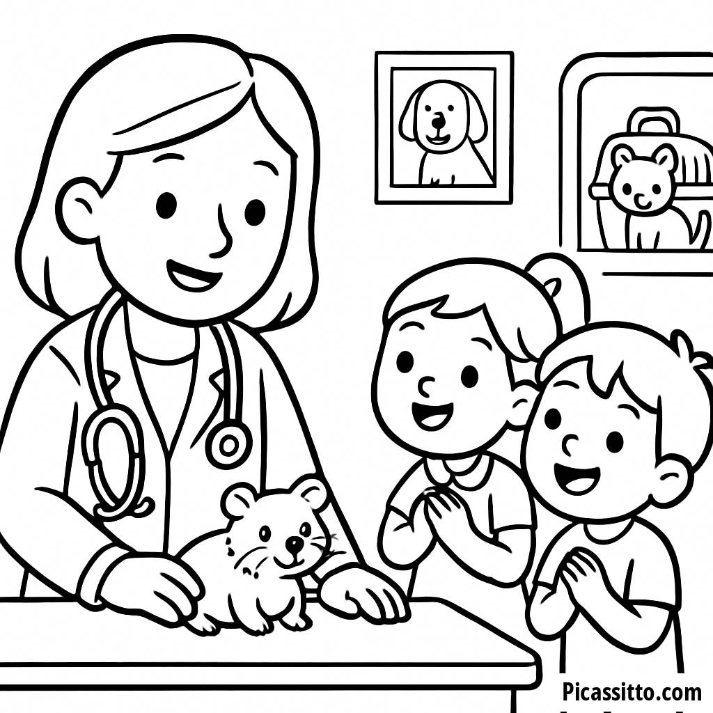 Divertiti con questa pagina da colorare gratuita e stampabile della clinica per animali impegnata, con un veterinario, un criceto e bambini emozionati! Perfetta per i piccoli amanti degli animali.