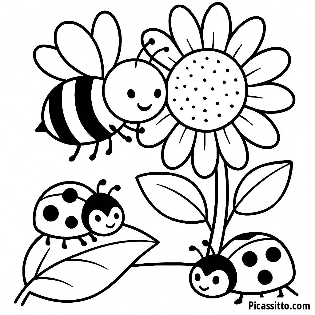 Scarica questa pagina da colorare gratuita e stampabile di un'ape impegnata a raccogliere nettare da un vivace girasole, con simpatiche coccinelle nei dintorni!